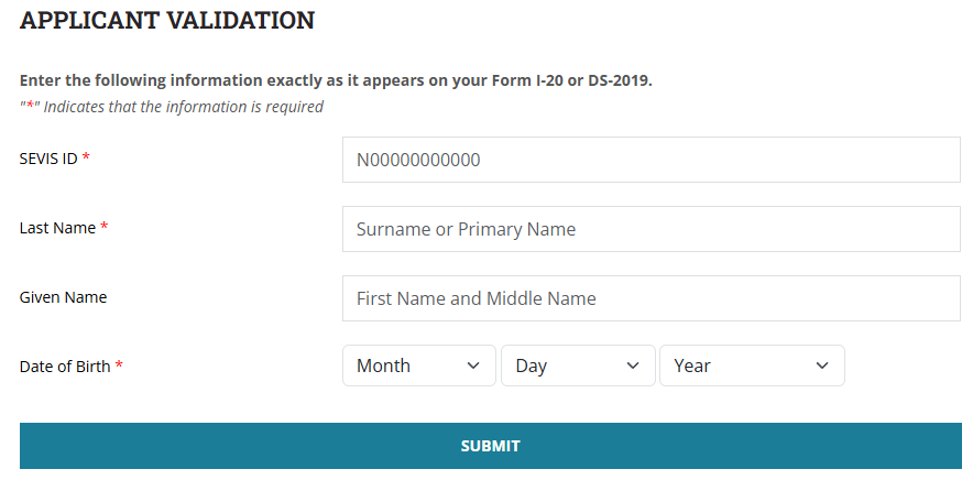 - Fill out this completely and correct with the information on your I-20 form. Note: The SEVIS Identification Number or SEVIS ID E.g. N0000000000 on your I-20.
